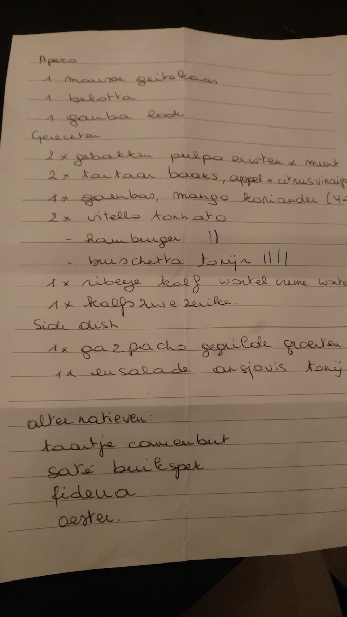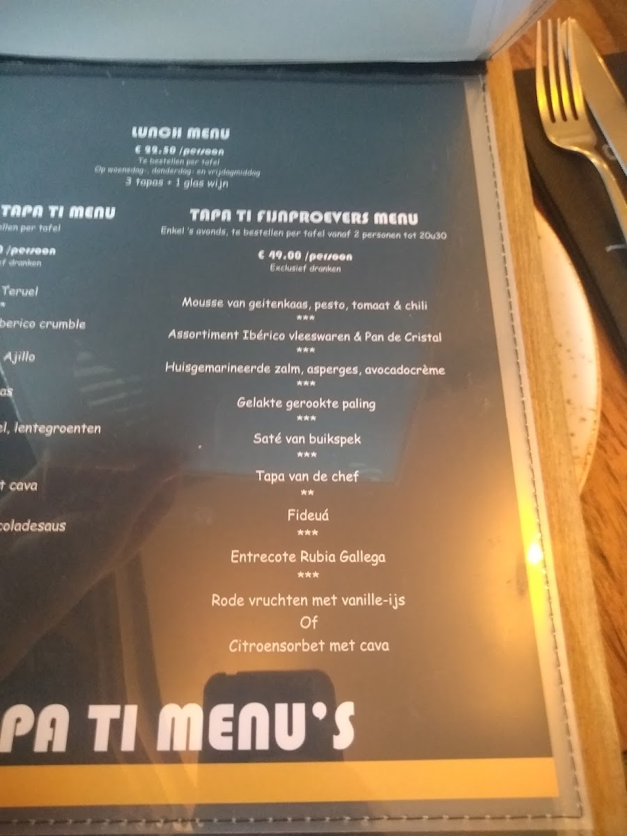Tapa Ti offers a delightful selection of Spanish-inspired dishes, with an emphasis on sharing and savoring bold flavors. The menu is centered around a variety of Tapas, which provides the perfect opportunity to sample a little bit of everything. Among the standout options are the Plancha Chorizo Salchichon Etc, a sizzling platter of cured meats that delivers a rich, smoky taste, and the Kroketten Met Gamba Zalm En Kip, which combines crispy croquettes with a luscious filling of shrimp, salmon, and chicken. The Mini Hamburgers are an ideal choice for those seeking a familiar comfort with a gourmet twist, while the refreshing Carpaccio Zeebaars Appelle Yoghurt offers a light and tangy option, featuring sea bass with apple and yogurt. For those craving something heartier, the Patatas Bravas And Polish Entrecote delivers a satisfying combination of crispy potatoes with a tender, flavorful steak. Finally, the Fideua, a delicious variation of paella with noodles instead of rice, brings a unique taste of Spain that’s perfect for anyone looking to explore a new take on traditional dishes. With its diverse and vibrant menu, Tapa Ti provides a dining experience that promises both variety and quality in every bite.